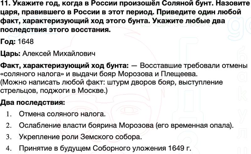 11. Укажите год, когда в России произошёл Соляной бунт. Назовите царя, правившего в России в этот период. Приведите один любой факт, характеризующий ход этого бунта. Укажите любые два последствия этого восстания.