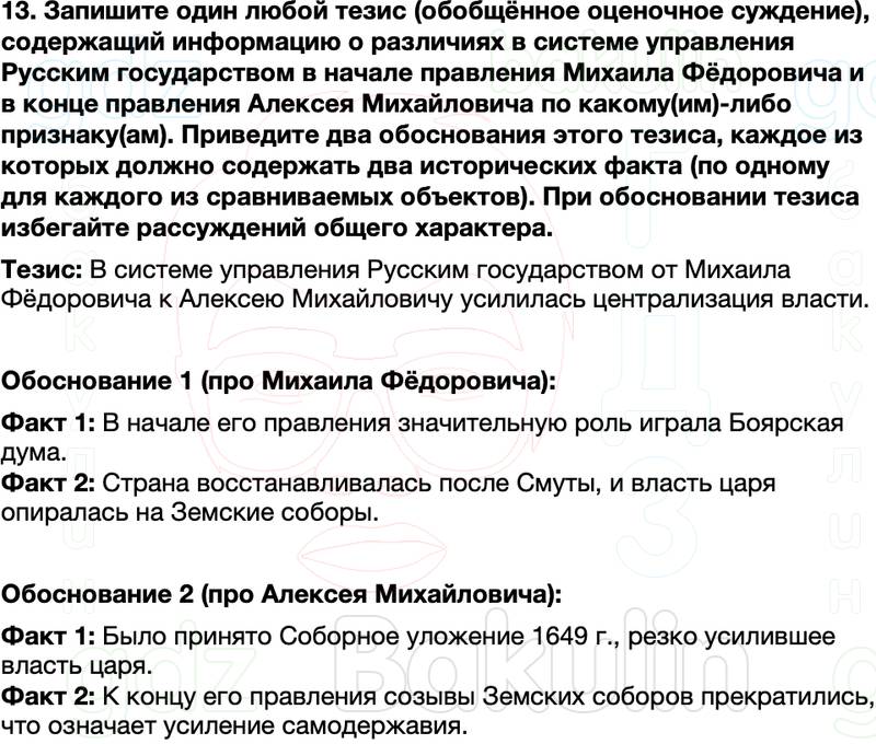 13. Запишите один любой тезис (обобщённое оценочное суждение), содержащий информацию о различиях в системе управления Русским государством в начале правления Михаила Фёдоровича и в конце правления Алексея Михайловича по какому(им)-либо признаку(ам). Приведите два обоснования этого тезиса, каждое из которых должно содержать два исторических факта (по одному для каждого из сравниваемых объектов). При обосновании тезиса избегайте рассуждений общего характера.