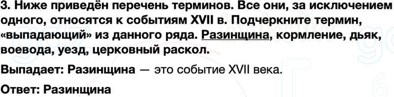 3. Ниже приведён перечень терминов. Все они, за исключением одного, относятся к событиям XVII в. Подчеркните термин, «выпадающий» из данного ряда. Разинщина, кормление, дьяк, воевода, уезд, церковный раскол.