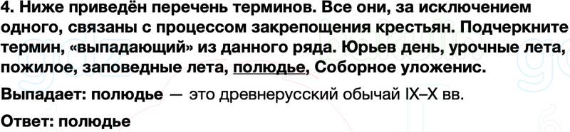 4. Ниже приведён перечень терминов. Все они, за исключением одного, связаны с процессом закрепощения крестьян. Подчеркните термин, «выпадающий» из данного ряда. Юрьев день, урочные лета, пожилое, заповедные лета, полюдье, Соборное уложенис.