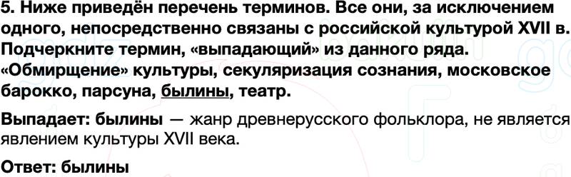 5. Ниже приведён перечень терминов. Все они, за исключением одного, непосредственно связаны с российской культурой XVII в. Подчеркните термин, «выпадающий» из данного ряда. «Обмирщение» культуры, секуляризация сознания, московское барокко, парсуна, былины, театр.