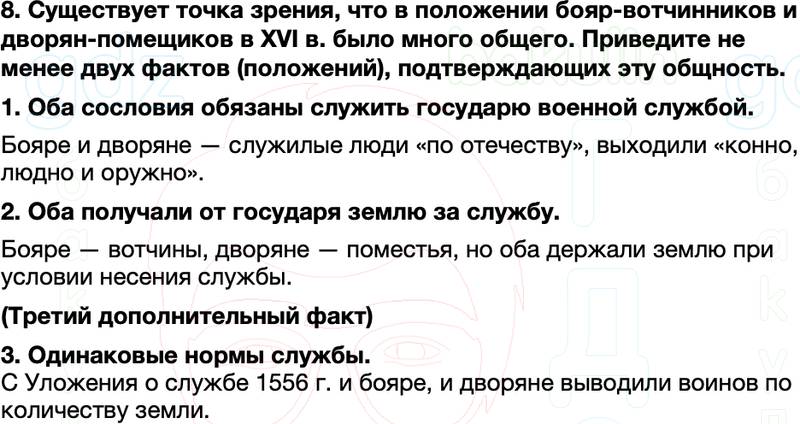 8. Существует точка зрения, что в положении бояр-вотчинников и дворян-помещиков в XVI в. было много общего. Приведите не менее двух фактов (положений), подтверждающих эту общность.