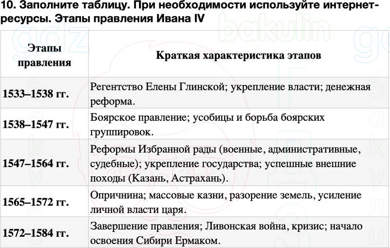 10. Заполните таблицу. При необходимости используйте интернет-ресурсы. Этапы правления Ивана IV