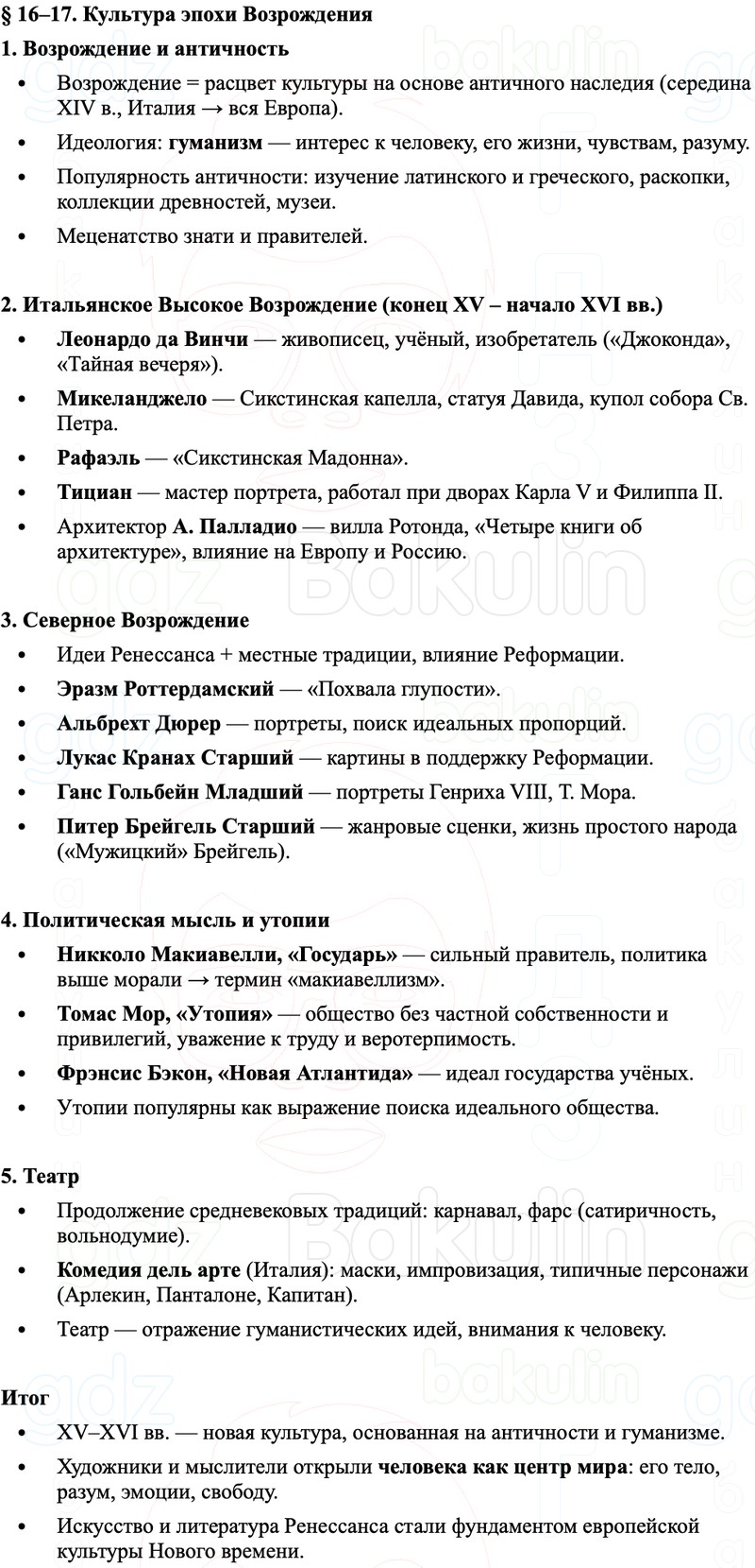 Краткое содержание и пересказ Параграф 16–17 Культура эпохи Возрождения