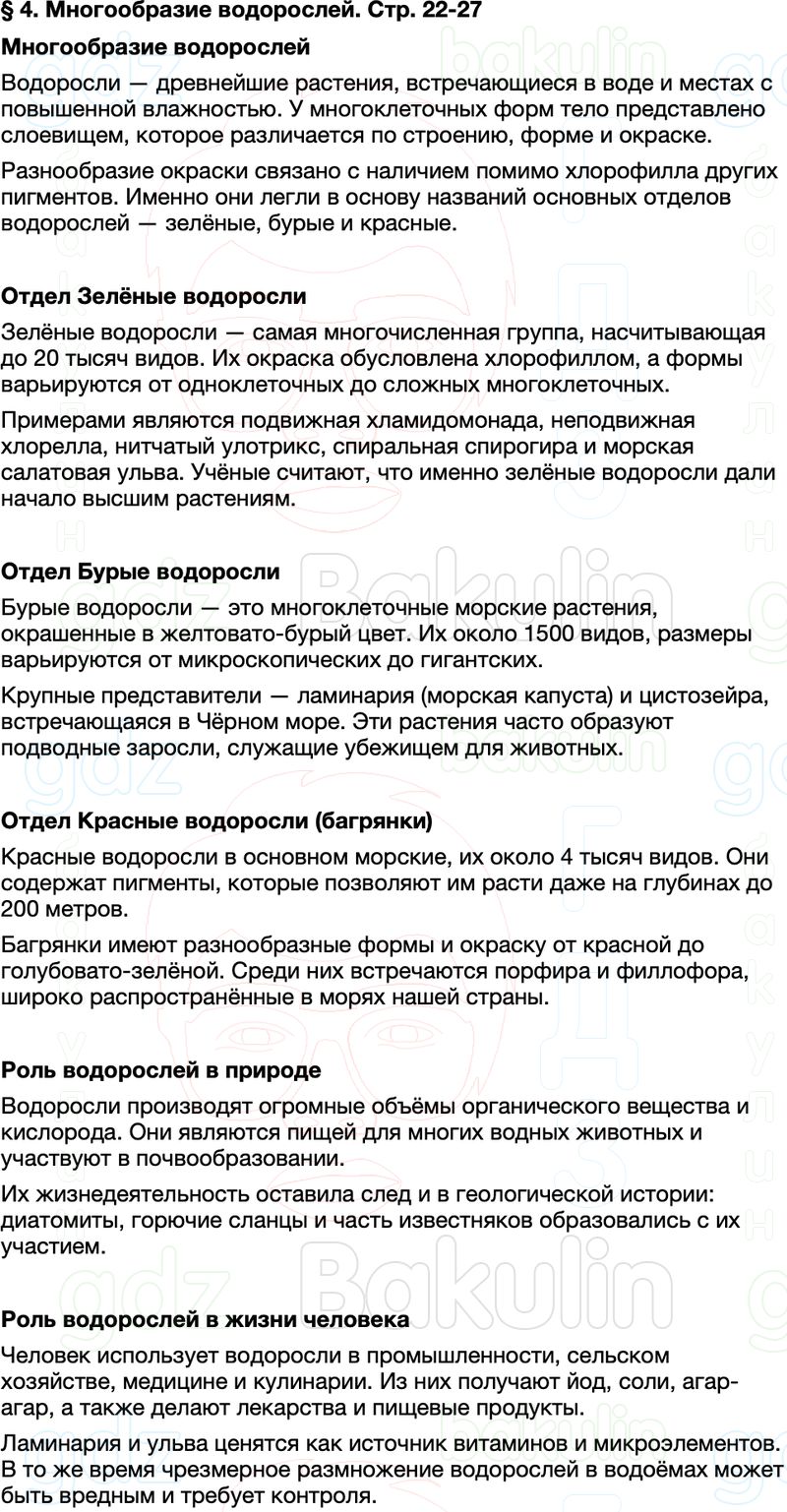 Краткое содержание пересказ Параграф 4 Многообразие водорослей