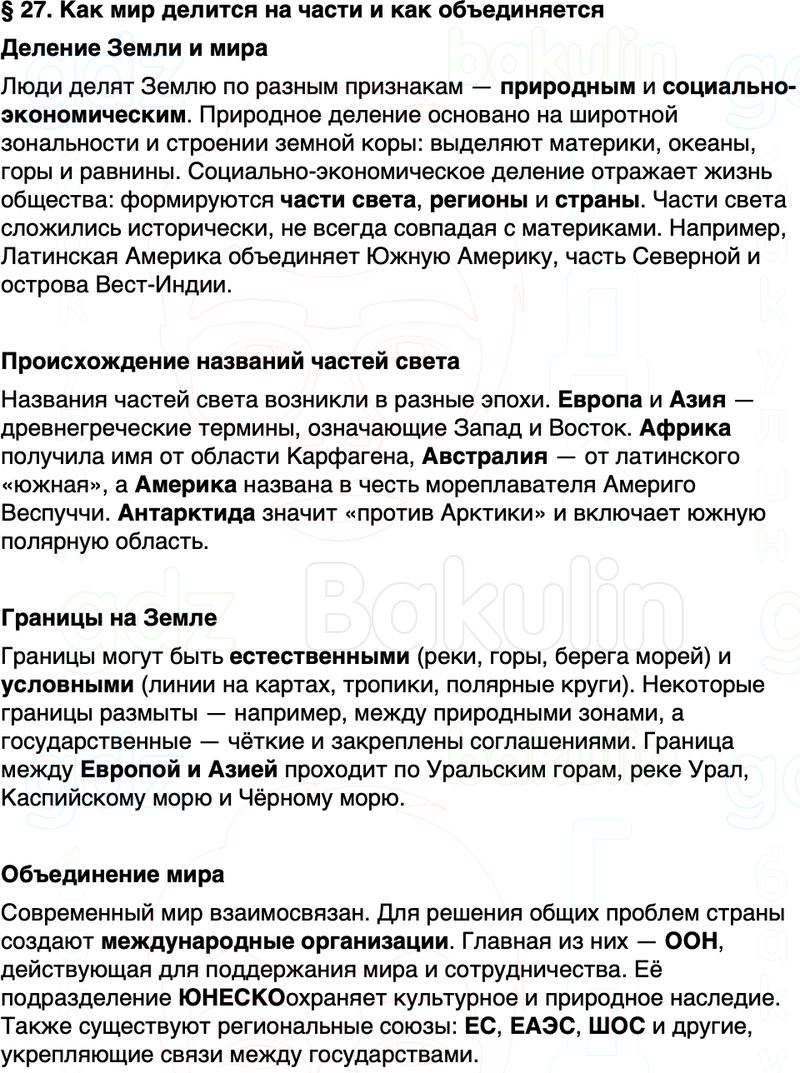 Краткое содержание пересказ Параграф 27. Как мир делится на части и как объединяется