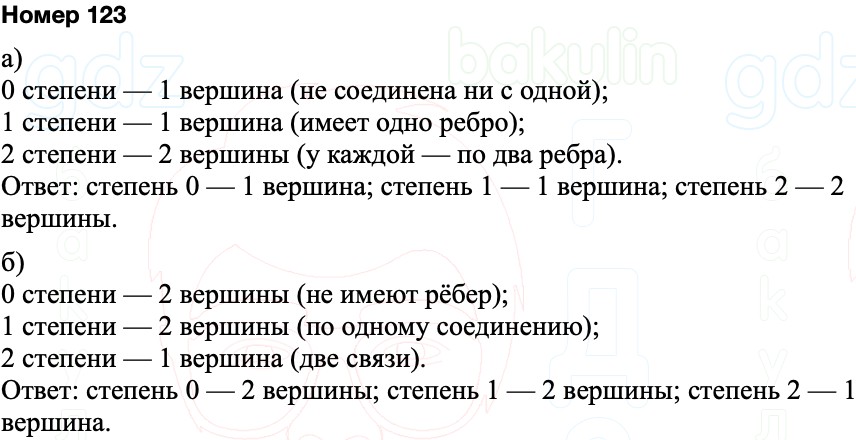 На рисунках 19, а и 19, б (с. 81) изображены графы. Сколько у каждого из них вершин степени 0, степени 1 и степени 2?