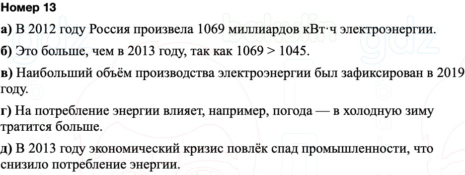 б) В каком году электроэнергии было произведено больше: в 2012 или в 2013 г.?