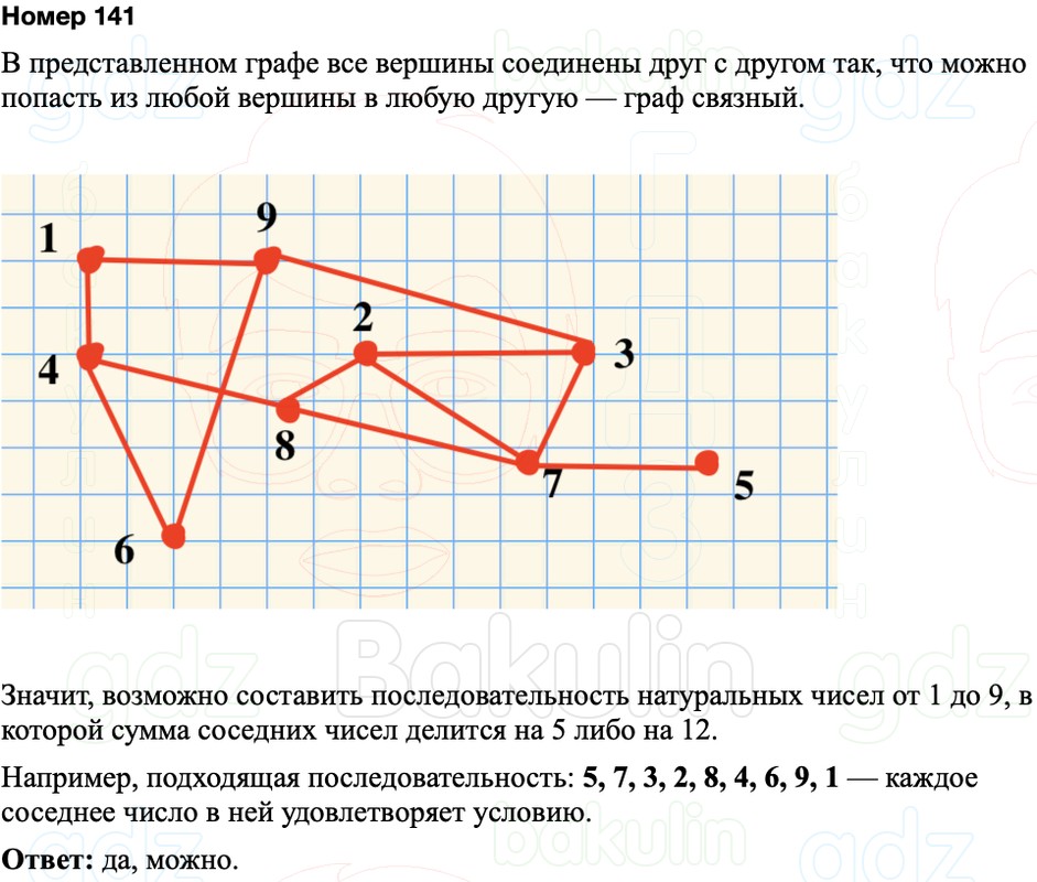 Можно ли выписать в ряд натуральные числа от 1 до 9 так, чтобы сумма любых двух, стоящих рядом, делилась на 5 или на 12? Указаные. Постройте граф, соединив рёбрами числа, которые могут стоять рядом. Затем найдите какую-нибудь цепь в этом графе, проходящую через все рёбра.