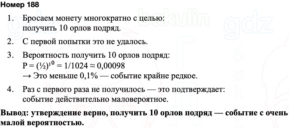 Подбросьте монету 10 раз. Удалось ли вам с первой попытки выбросить десять орлов? Как вы думаете, можно ли считать такое событие маловероятным?