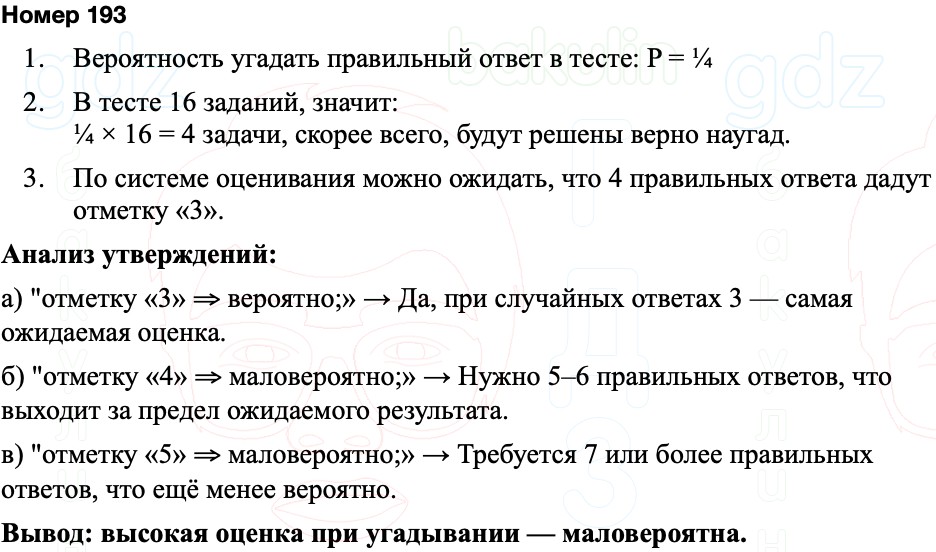 В тесте по биологии 16 задач с выбором ответа из четырёх предложенных варианов. Верный вариант только один. Тройку ставят за 4 правильных ответа, четвёрку - за 12, а пятёрку - за 15 правильных ответов. Вася не готов к тесту и выбирает ответы наудачу. Разумно ли ожидать, что Вася получит: a) отметку «З»; б) отметку «4»; в) отметку «5»?