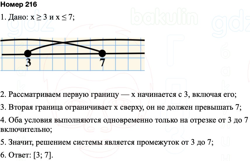 Решая систему двух неравенств относительно переменной х, школьник получил отдельно решения обоих неравенств: х ³ 3 и х £ 7. Укажите промежуток, который является решением системы, и изобразите его на числовой прямой.