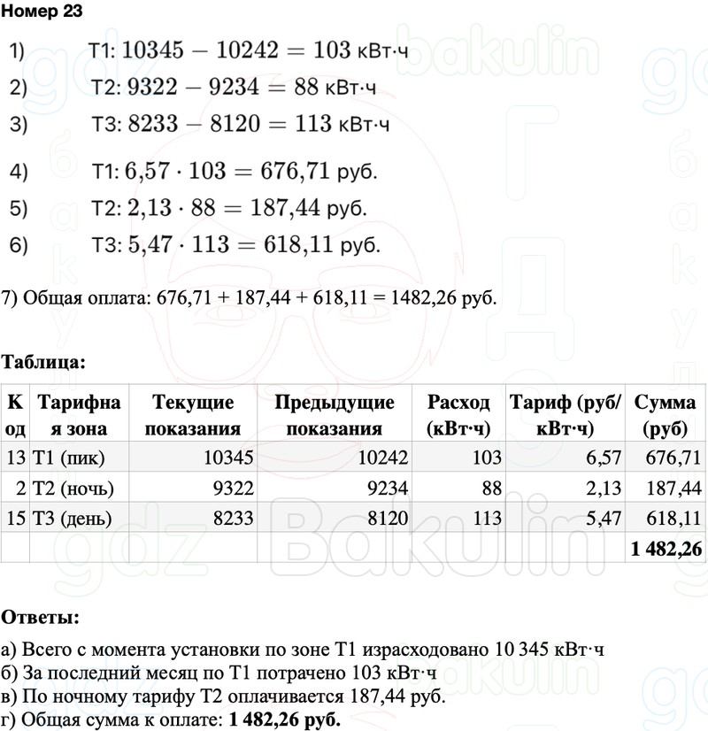 г) ((10345 – 10242) * 6,57) + ((9322 – 9234) * 2,13) + ((8233-8120) * 5,47)) = 676,71 + 187,44 + 618,11 = 1482,26 руб всего
