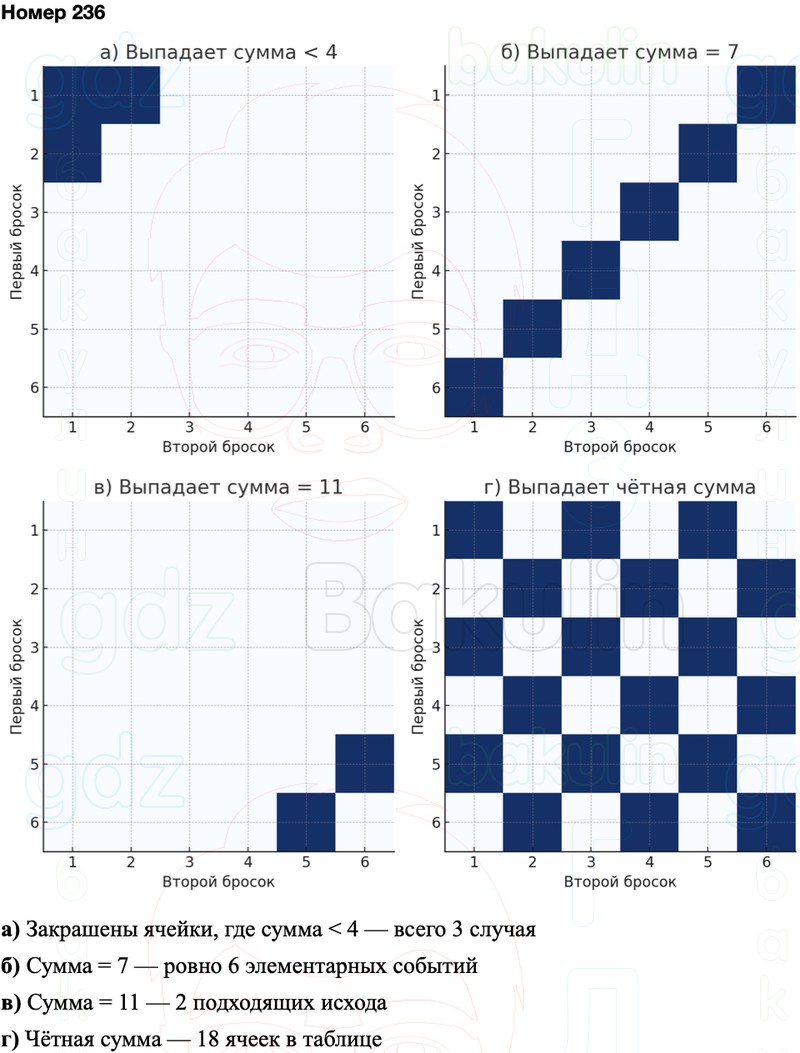 Игральную кость подбрасывают дважды. Нарисуйте в тетради таблицу элементарных событий этого эксперимента. Закрасьте в таблице элементарные события, при которых в сумме выпадет: