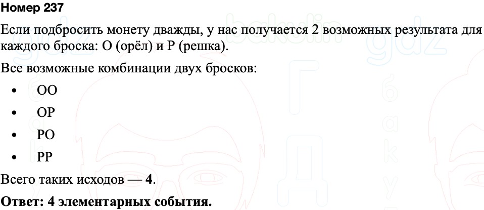 При подбрасывании монеты будем обозначать буквой О выпадение орла, буквой Р - выпадение решки. Подбросим монету два раза. Элементарное событие «выпадет два орла» записывается как ОО. Выпишите все элементарные события этого опыта. Сколько их?