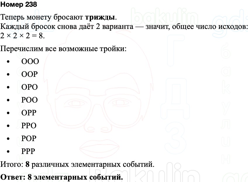 Монету бросают 3 раза. Выпишите все элементарные события этого опыта, пользуясь обозначениями О для орла и Р для решки. 239