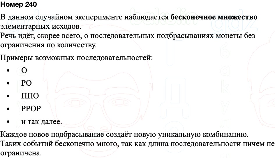 Монету бросают до тех пор, пока не выпадет орёл. Пользуясь обозначениями О и Р, запишите несколько элементарных событий этого опыта. Сколько всего элементарных событий в этом случайном опыте?