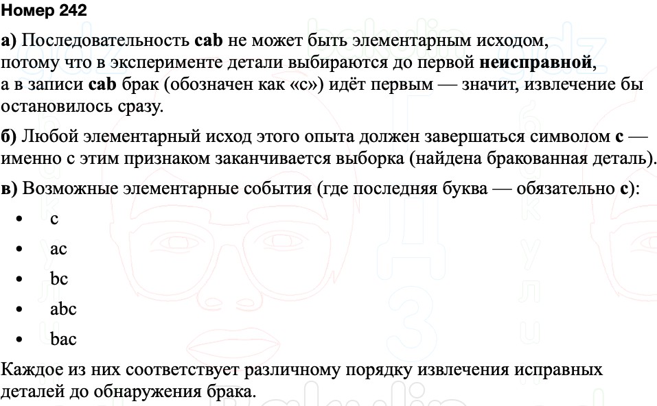 В ящике три детали: две исправные детали а и b и одна бракованная деталь с. Из ящика наугад извлекают по одной детали, пока не обнаружат бракованную. Элементарные события этого опыта будем записывать в виде последовательности букв. Например, abc, ас и т. д.