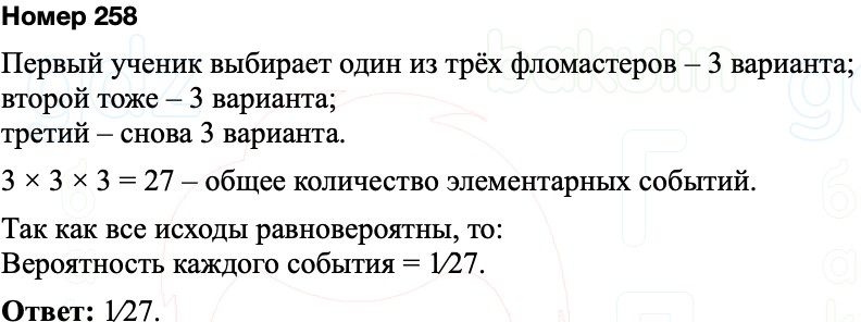 Три первоклассника по очереди выбирают фломастеры. Каждый из них выбирает фломастер одного из трёх цветов: зелёного (3), синего (С) или красного (К). Сколько у этого опыта элементарных событий? Считая, что все элементарные события равновозможны, найдите вероятность каждого из них.