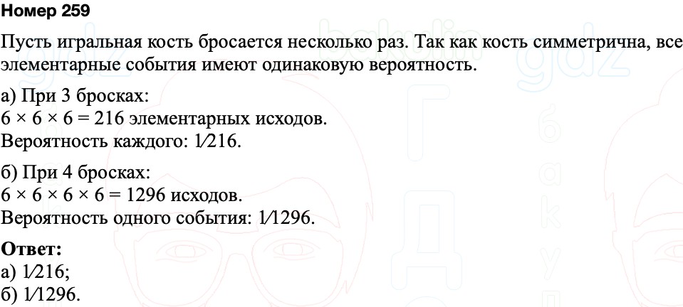 Игральную кость подбрасывают несколько раз. Равновозможны ли элементарные события такого опыта? Найдите вероятность каждого элементарного события при: а) трёх бросаниях; б) четырёх бросаниях.