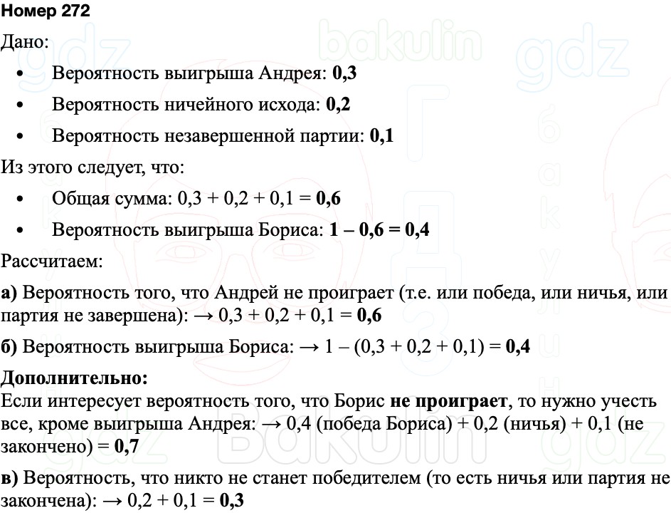 Андрея равна 0,3, вероятность ничьей равна 0,2, вероятность того, что партия не будет закончена, равна 0,1.