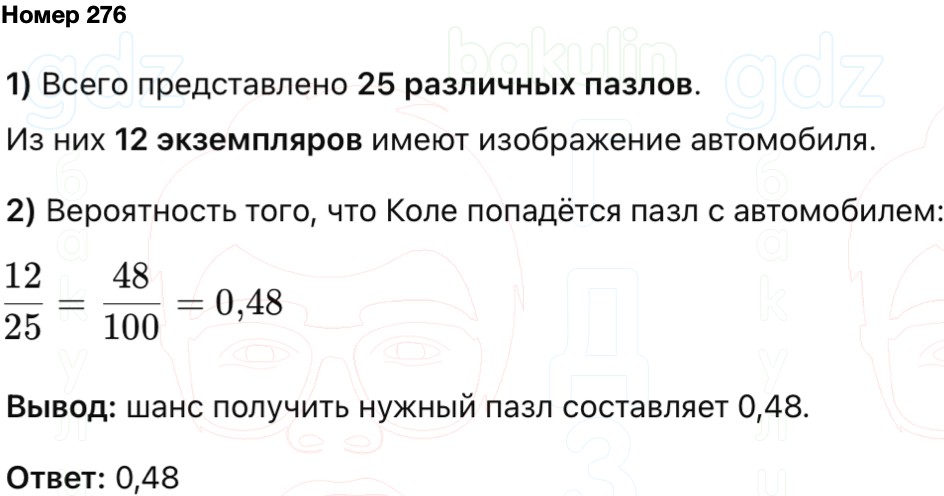 Родительский комитет закупил 25 пазлов для подарков детям на Новый год. Пазлы с разными рисунками: 12 с автомобилями и 13 с видами городов. Подарки распределяются случайным образом между 25 детьми, среди которых есть Коля. Найдите вероятность того, что Коле достанется пазл с автомобилем.