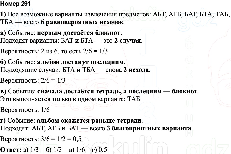 Миша покупает альбом (А), блокнот (Б) и тетрадь (Т). Продавец достаёт эти товары в произвольном порядке. Найдите вероятность того, что: