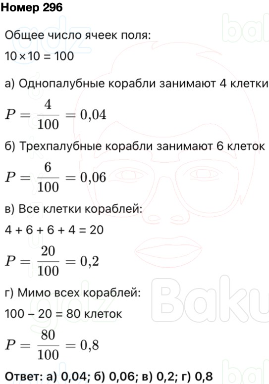 По правилам игры «Морской бой» на поле 10 × 10 клеток размещаются четыре однопалубных корабля (по одной клетке), три двухпалубных, два трёхпалубных и один четырёхпалубный (рис. 68). Игрок делает первый случайный выстрел. Найдите вероятность того, что он: