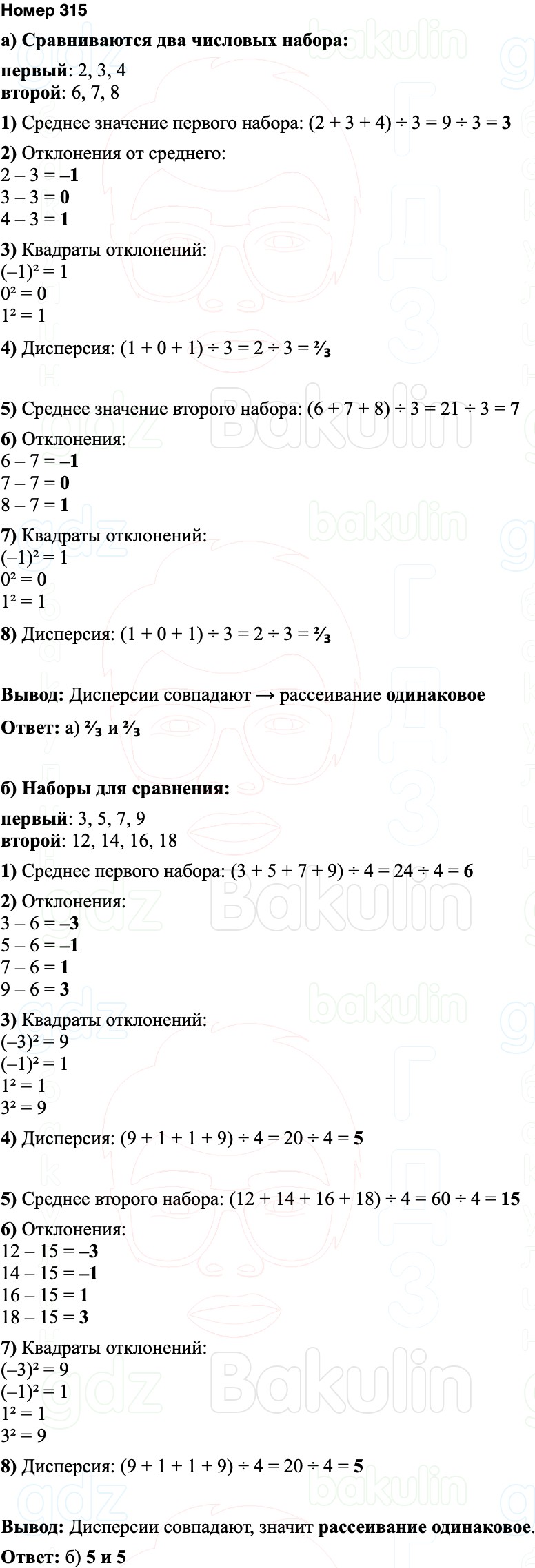 Даны два набора чисел. Отметьте числа на числовой прямой. Определите на глаз, у какого из наборов рассеивание значений больше. Проверьте ваш глазомер, вычислив и сравнив дисперсии наборов.