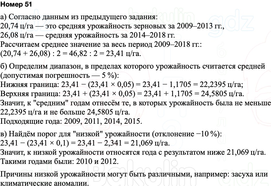 в) Назовём год из данного периода (см. табл. 23) низкоурожайным, если урожайность зерновых в этот год ниже средней больше чем на 10%. Какие годы были низкоурожайными? Каковы, по вашему мнению, причины низкой урожайности в эти годы?