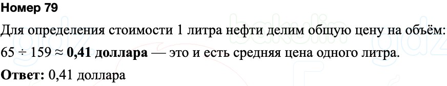 Средняя цена нефти на протяжении месяца составляла 65 долл. за один баррель (мера объёма, равная 158,9873 л.). Найдите среднюю цену одного литра нефти за этот период, считая, что в одном барреле 159 л.