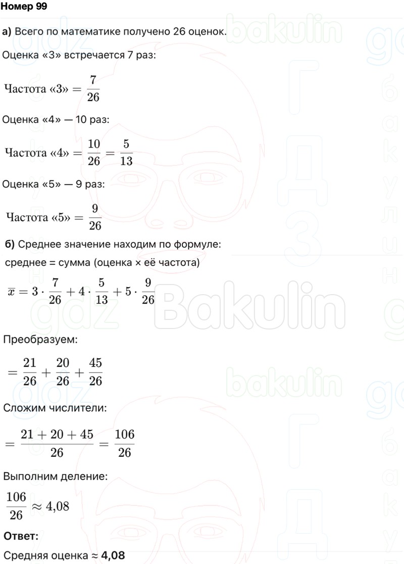 Оценка «4» — 10 раз, что составляет 10/26=5/13
