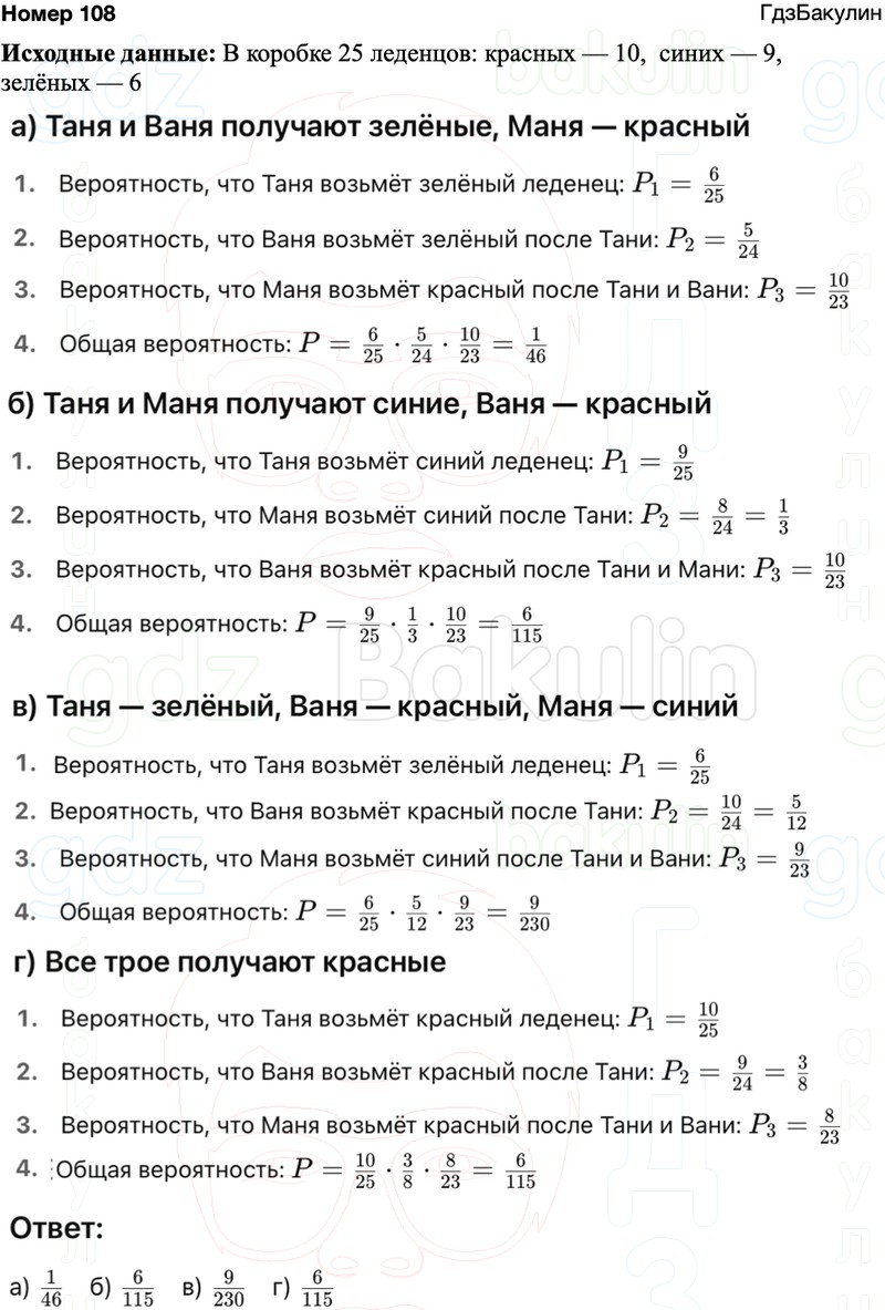 a) Таня и Ваня получат зелёные, а Маня - красный леденец;