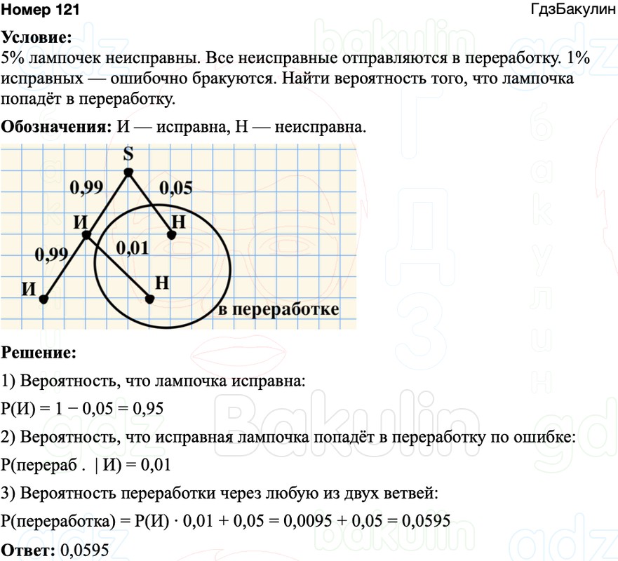 На заводе производят электрические лампочки, причём 5% всех изготовленных лампочек неисправны. Система контроля качества выявляет все неисправные лампочки, но по ошибке бракует ещё 1% исправных лампочек. Все забракованные лампочки поступают в переработку, а остальные - в продажу. Найдите вероятность того, что очередная изготовленная лампочка отправится в переработку.
