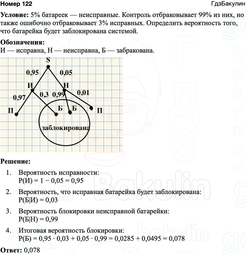 Автоматическая линия изготавливает батарейки. Вероятность того, что готовая батарейка неисправна, равна 0,05. Перед упаковкой каждая батарейка проходит систему контроля. Эта система бракует 99% неисправных батареек и по ошибке бракует 3% исправных батареек. Найдите вероятность того, что очередная изготовленная батарейка будет забракована системой контроля.