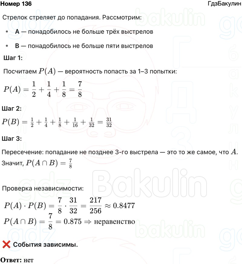 Стрелок в тире стреляет по мишени до тех пор, пока не собьёт её. Рассмотрим события А «стрелку потребовалось не более трёх выстрелов» и В «стрелку потребовалось не более пяти выстрелов». Являются ли события А и В независимыми?