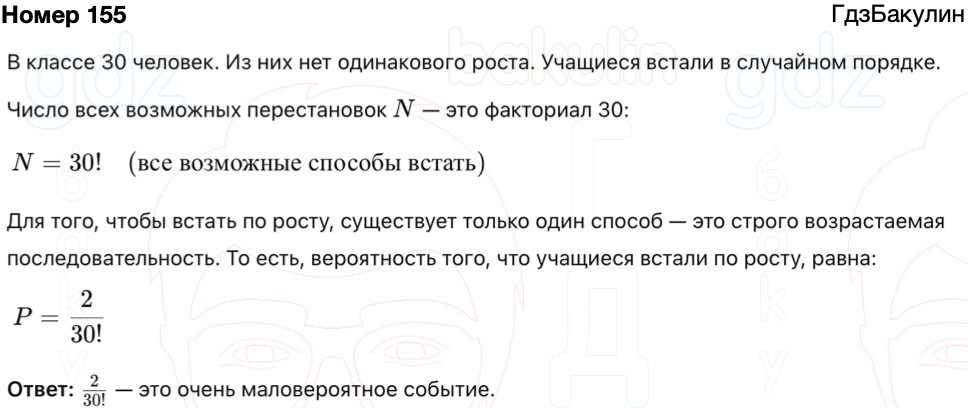 В классе 30 человек. Среди них нет двоих одинакового роста. По команде учителя физкультуры они выстраиваются в одну шеренгу в случайном порядке. Найдите вероятность того, что они встали по росту.