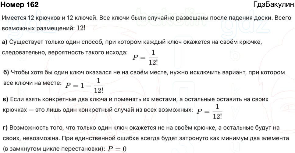 У вахтёра в комнате доска с крючками. Всего 12 крючков, а на них 12 ключей. Доска упала и ключи рассыпались. Вахтёр собрал ключи и развесил их в случайном порядке. Какова вероятность того, что: