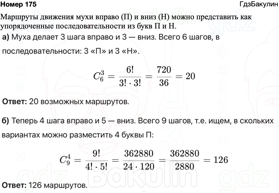 Указание. В случае а), как бы ни ползла муха, она должна сделать всего 6 шагов: три шага вправо (П) и три шага вниз (Н). Маршрут мухи можно записать в виде последовательности шести букв. Например, ПНПННП.