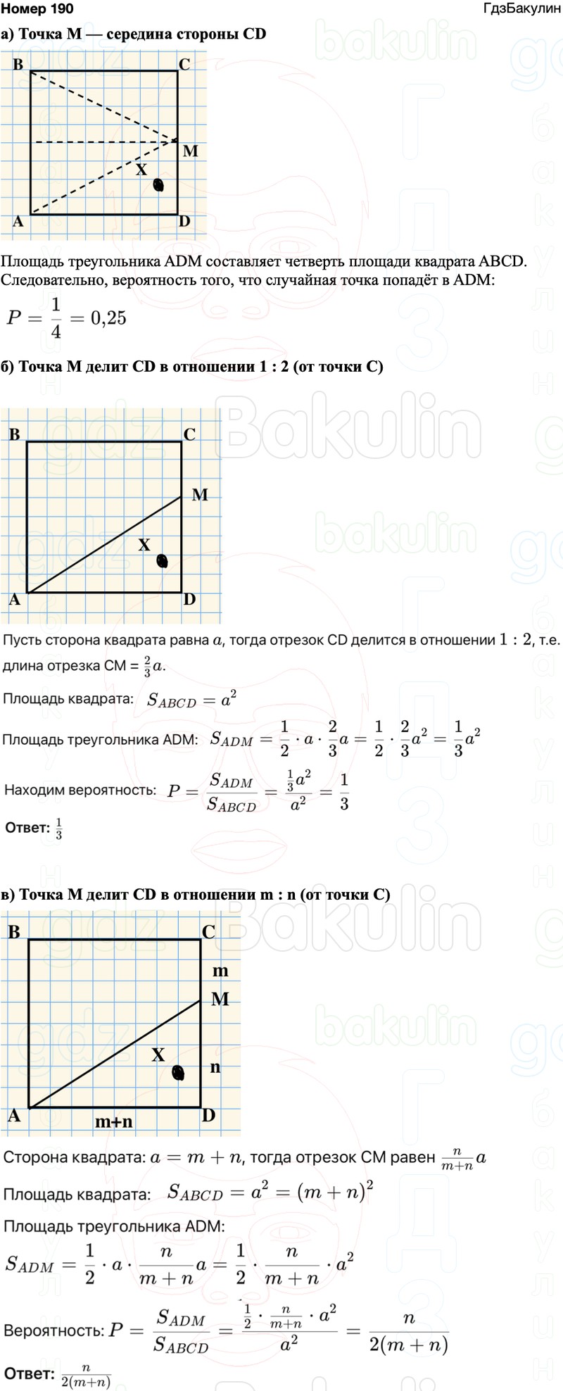 В квадрате ABCD случайным образом выбирается точка X. Найдите вероятность того, что эта точка принадлежит треугольнику ADM, где точка М: