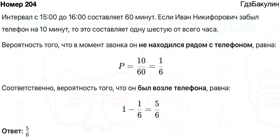 Иван Иванович обещал позвонить Ивану Никифоровичу между 15:00 и 16:00. Известно, что Иван Иванович всегда держит своё слово. Иван Никифорович ждал звонка, но около половины четвёртого отлучился на 10 минут, забыв взять с собой телефон. Найдите вероятность того, что, когда Иван Иванович позвонил, Иван Никифорович был у телефона.