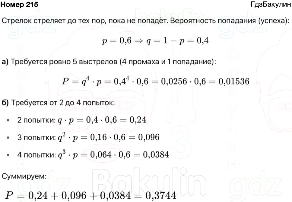 Стрелок в тире стреляет по мишени до тех пор, пока не попадёт в неё. Вероятность попадания при каждом отдельном выстреле равна р - 0,6. Найдите вероятность того, что стрелку потребуется:
