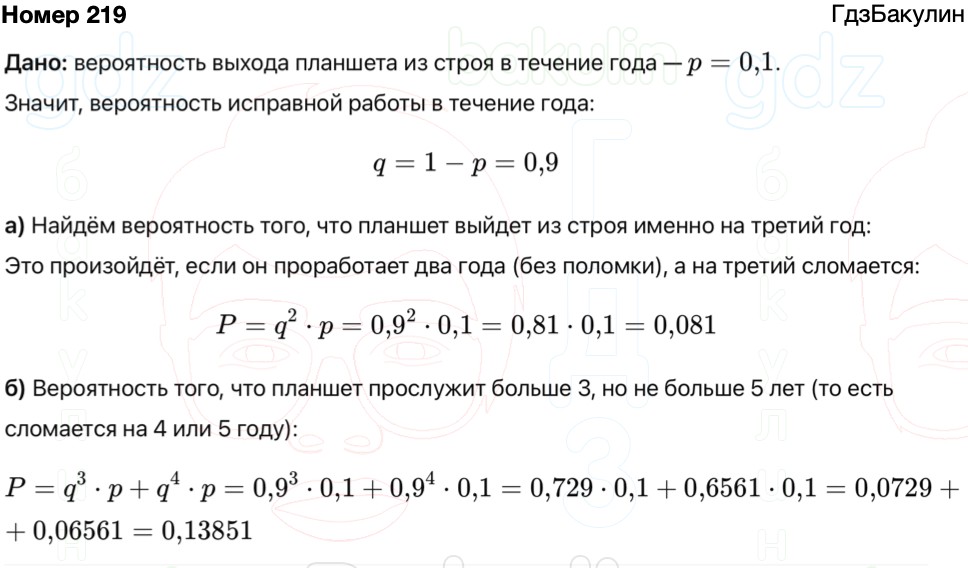 Вероятность того, что новый планшет выйдет из строя в течение года после покупки, равна 0,1. Если планшет проработал несколько лет, то вероятность его поломки в течение следующего года такая же. Найдите вероятность того, что новый планшет выйдет из строя: