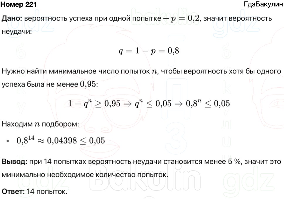 Инженеры проектируют систему автоматической передачи информации от автомобиля в кризисный центр в случае аварии. Возможны помехи разного рода, поэтому система должна уметь делать несколько попыток, чтобы достичь успеха. Число попыток нужно ограничить, чтобы система не зависла. По техническому заданию вероятность передачи информации должна быть не ниже 0,95, если вероятность успеха в каждой отдельной попытке 0,2. Каким числом ограничить разрешённое количество попыток?