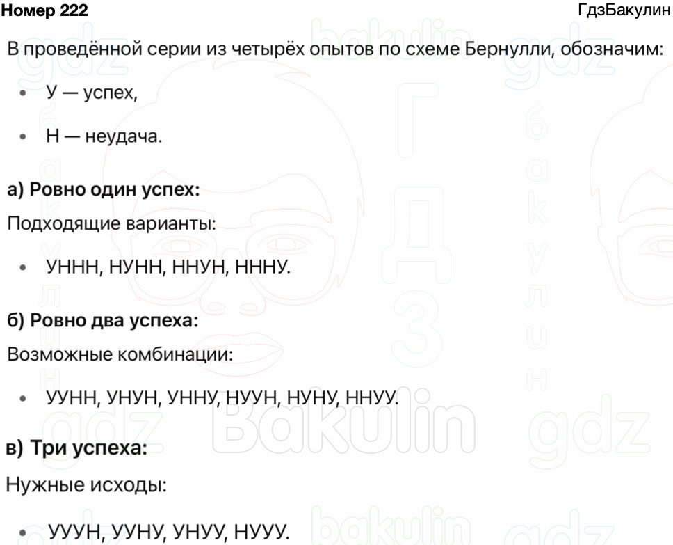 Эксперимент состоит из четырёх последовательных испытаний Бернулли. Пользуясь обозначениями У для успеха и Н для неудачи, выпишите все элементарные события, в которых ровно: