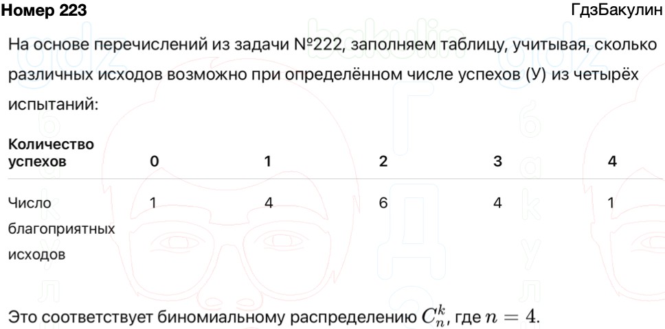 Пользуясь результатами задачи 222, перечертите в тетрадь и заполните таблицу 6, в которой указано, сколько может быть элементарных событий без успехов, с одним успехом, с двумя успехами и т. д. в серии из четырёх испытаний Бернулли.