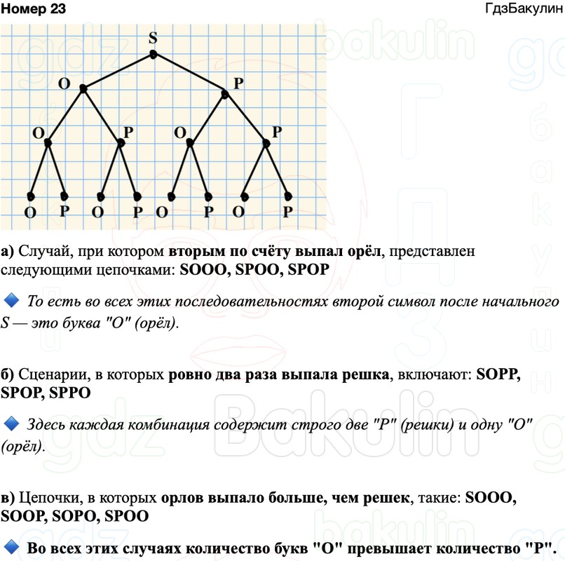 Постройте дерево случайного опыта, в котором монету бросают 3 раза. Отметьте в этом дереве цепочки, изображающие элементарные события, благоприятствующие событию: