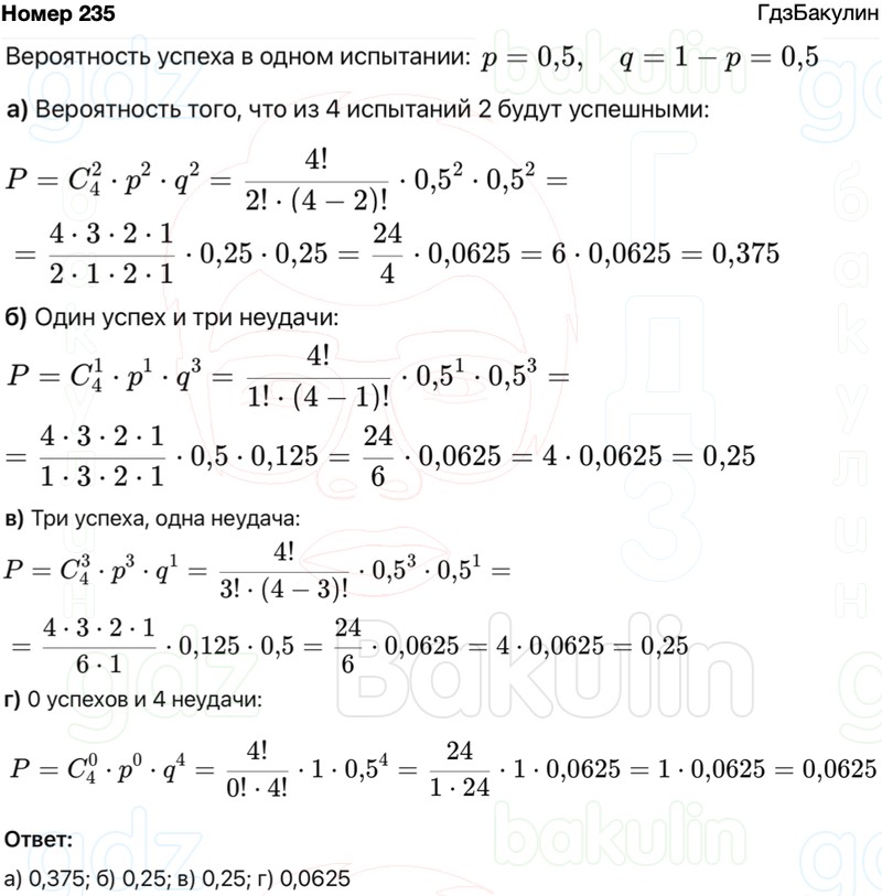 В некотором испытании Бернулли успех наступает с вероятностью р = 0,5. Найдите вероятность того, что в серии из 4 таких испытаний: