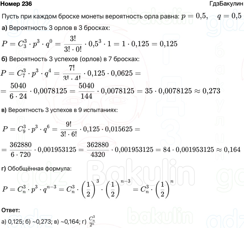 Найдите вероятность появления ровно трёх орлов, если монету бросают: