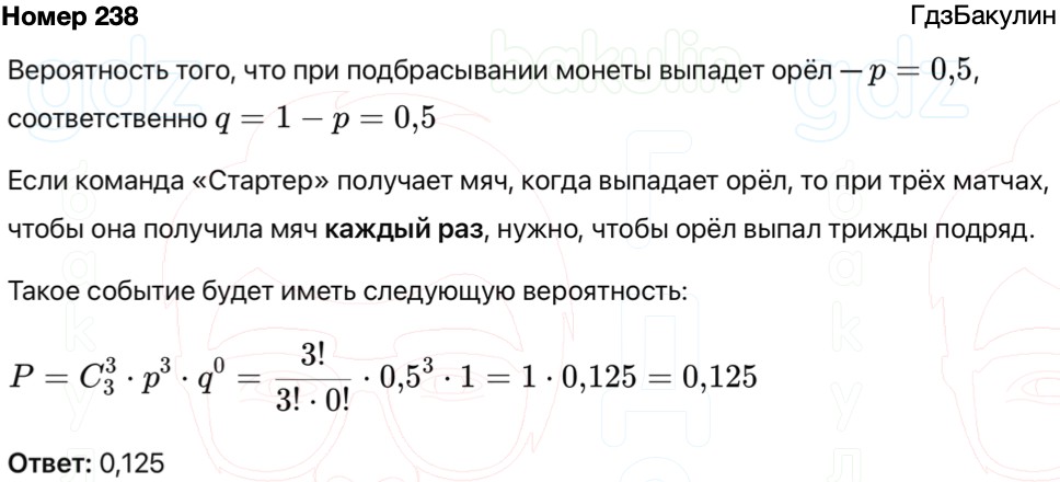 Перед началом футбольного матча судья бросает монету, чтобы определить, какая команда первой будет владеть мячом. Найдите вероятность того, что в трёх матчах, которые команда «Стартёр» проводит с другими командами, мяч каждый раз будет доставаться именно этой команде.
